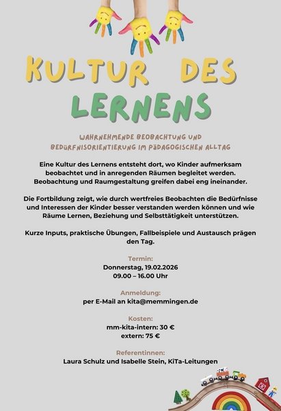 Hast du noch kurz Zeit für eine Fortbildung in unserer KiTa-Akademie? Dann melde dich schnell an unter kita@memmingen.de für unseren Workshop Kultur des Lernens! Wir freuen uns auf deine Teilnahme.